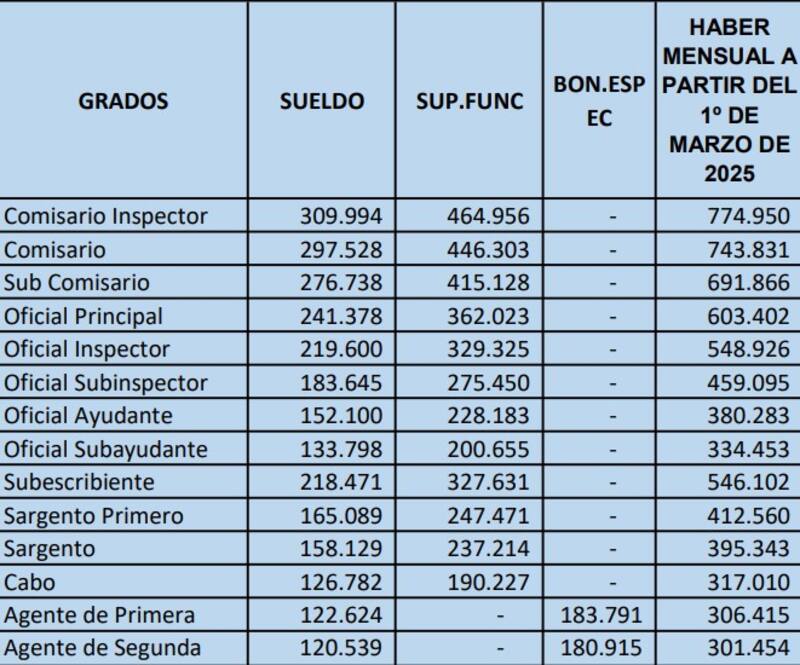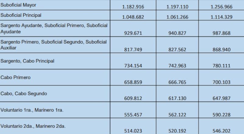 Asimismo, el nuevo ajuste también incidirá en el personal de la Policía de establecimientos navales a partir de marzo. Según el rango, los salarios variarán entre $ 301.454 y $ 774.950.
