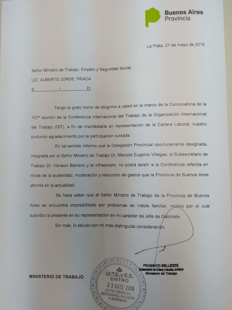 “La delegación oportunamente designada, integrada por el ministro de Trabajo Marcelo Villegas, (…) no podrá asistir a la Conferencia en miras de la austeridad, moderación y reducción de gastos que la provincia de Buenos Aires afronta en la actualidad , apunta una carta enviada a Triaca en la que también agradecen la invitación.