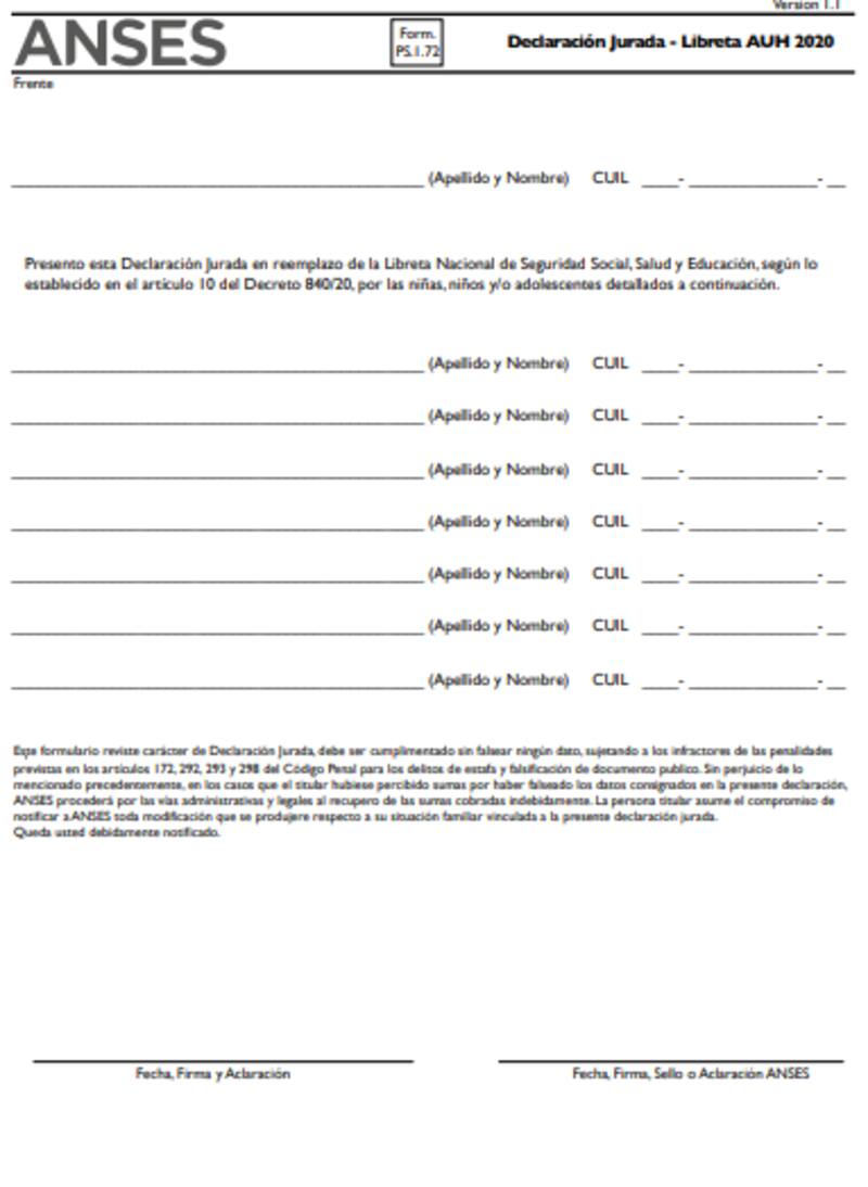 La Libreta de la Asignación Universal por Hijo (AUH) de ANSES o Declaración Jurada se completa una vez al año y permite acceder al cobro del 20% del complemento acumulado.