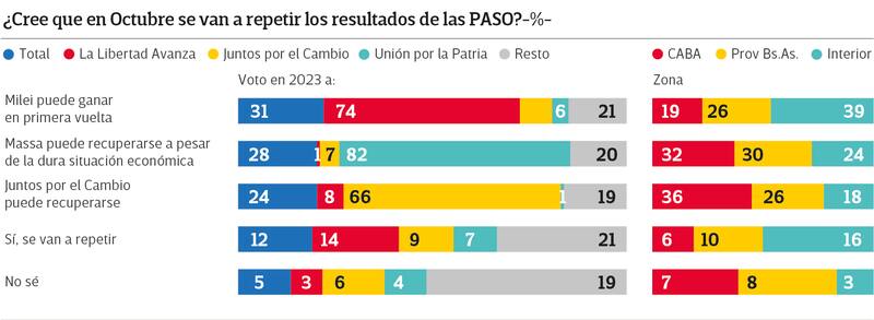 La mayor confianza en revertir el resultado la expresa el elector oficialista (82%), a pesar de la difícil situación económica, que forma parte de las principales preocupaciones sociales. En cambio, uno de cada tres votantes de JxC expresó su desconfianza sobre la posibilidad de que Bullrich pueda recuperarse y llegar a segunda vuelta. Y solo un 12% observa que se repetirá el reparto de tres tercios que ofrecieron las PASO.