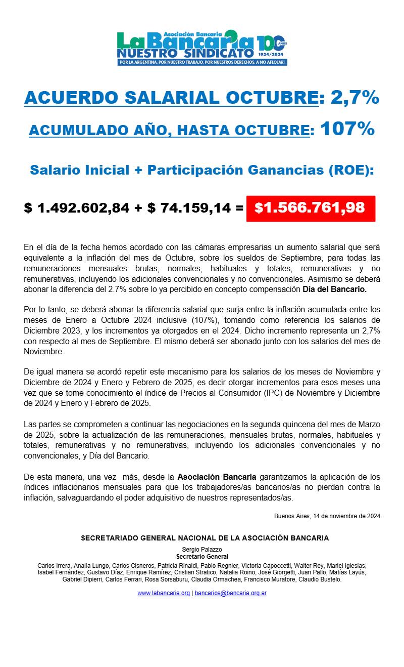 "De esta manera, una vez más, desde la Asociación Bancaria garantizamos la aplicación de los índices inflacionarios mensuales para que los trabajadores/as bancarios/as no pierdan contra la inflación, salvaguardando el poder adquisitivo de nuestros representados/as", destacaron desde La Bancaria.