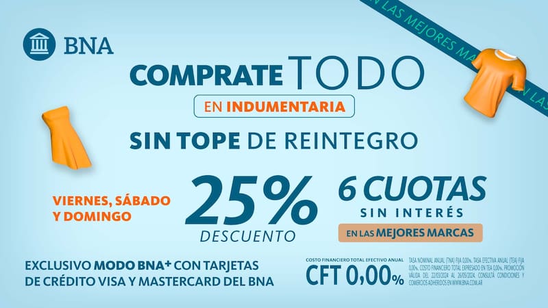 El Banco de la Nación Argentina(BNA) lanzó descuentos para la compra de todo tipo de indumentaria, sin límite de tope de reintegro y hasta chances de financiarlas en cuotas sin interés.