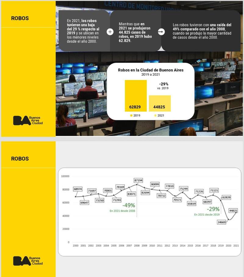 De acuerdo a los datos recopilados por el ministerio de Justicia y Seguridad porteño en base a las denuncias presentadas (lo que subrepresenta el fenómeno, dado que muchos incidentes no llegan a conocimiento de las autoridades), los robos bajaron 29% respecto de 2019, pasando de 62.829 en 2019 a 44.825 en 2021. Son los números más bajos desde el 2000.