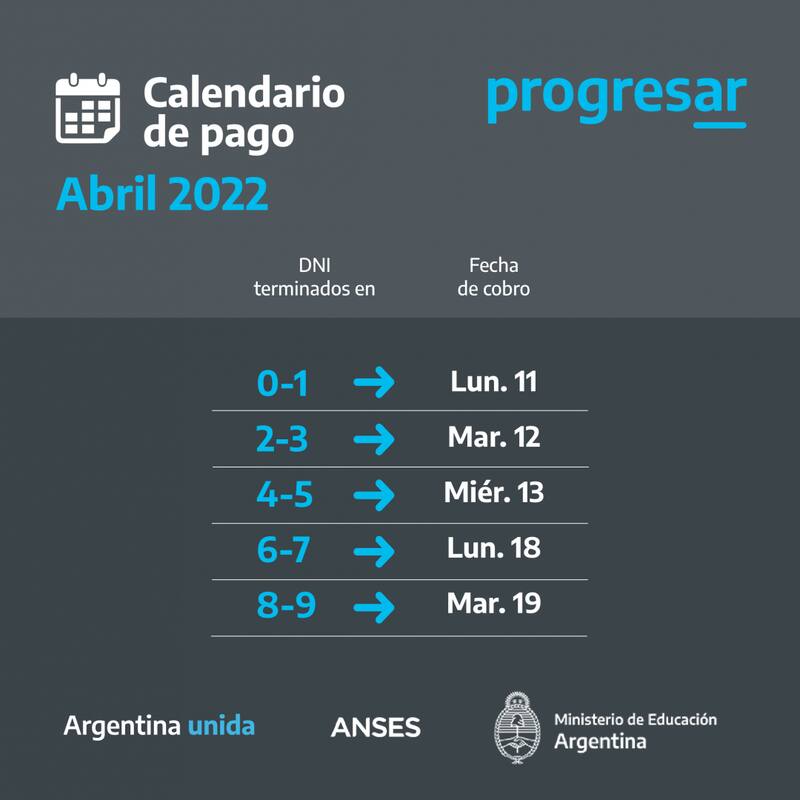 La Administración Nacional de la Seguridad Social (ANSES) habilitó el calendario de pagos de abril, que incluye a las Becas Progresar 2022 del Ministerio de Educación, cuya inscripción continúa habilitada hasta el 30 de abril.
