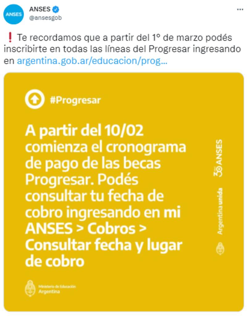 "Te recordamos que a partir del 1° de marzo podés inscribirte en todas las líneas del Progresar ingresando en https://argentina.gob.ar/educacion/progresar", anticipó días atrás el organismo conducido por Fernanda Raverta en redes sociales.