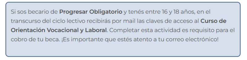 "Si sos becario de Progresar Obligatorio y tenés entre 16 y 18 años, en el transcurso del ciclo lectivo recibirás por mail las claves de acceso al Curso de Orientación Vocacional y Laboral. Completar esta actividad es requisito para el cobro de tu beca. ¡Es importante que estés atento a tu correo electrónico!", sumó.