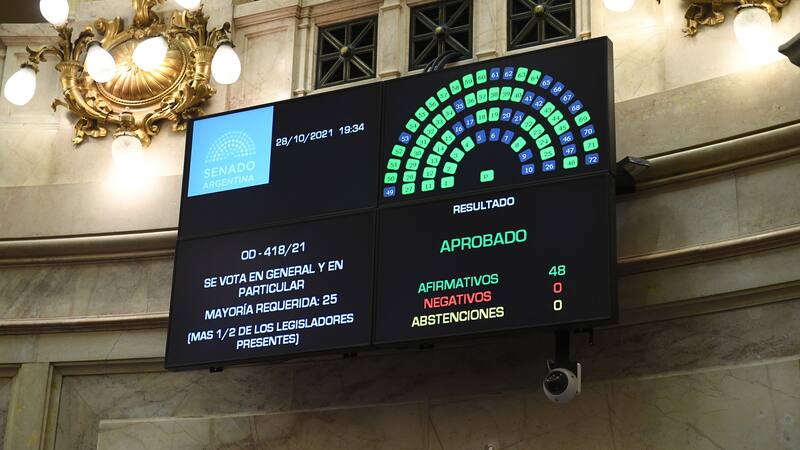 Pese a que la iniciativa no contaba con dictamen en el Senado, el Frente de Todos logró cosechar el acompañamiento de dos tercios de los senadores presentes en el recinto para su tratamiento "sobre tablas". Así, el proyecto será ley antes de las elecciones del 14 de noviembre.