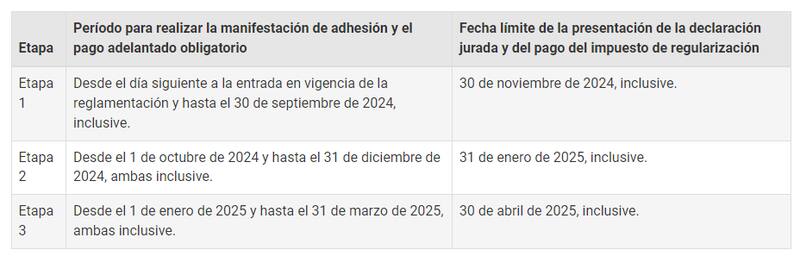 Por último, el pago del Impuesto Especial también estará dividido en tres etapas. "La fecha de la manifestación de adhesión definirá la etapa del régimen aplicable al contribuyente y a los bienes regularizados en esa etapa", detalla Economía.