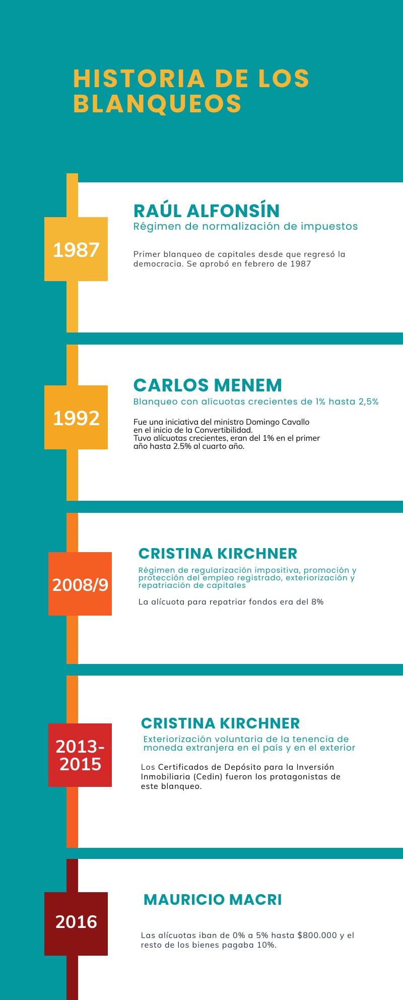 El gobierno de Mauricio Macri realizó el mayor blanqueo de la historia Argentina en 2016. De acuerdo a la ley, quienes declaraban hasta 19.000 dólares no debían tributar, entre ese valor y 50.000 dólares tenían una alícuota de 5% y si se exteriorizaba un capital mayor una del 10%.