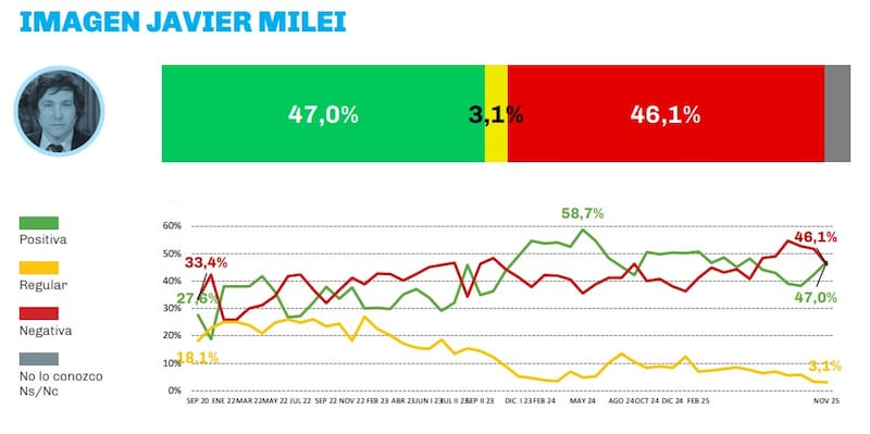 El sondeo, realizado los últimos días de noviembre entre 2500 casos a nivel nacional, refleja que la imagen positiva de Milei alcanzó el 47% durante el anteúltimo mes del año.