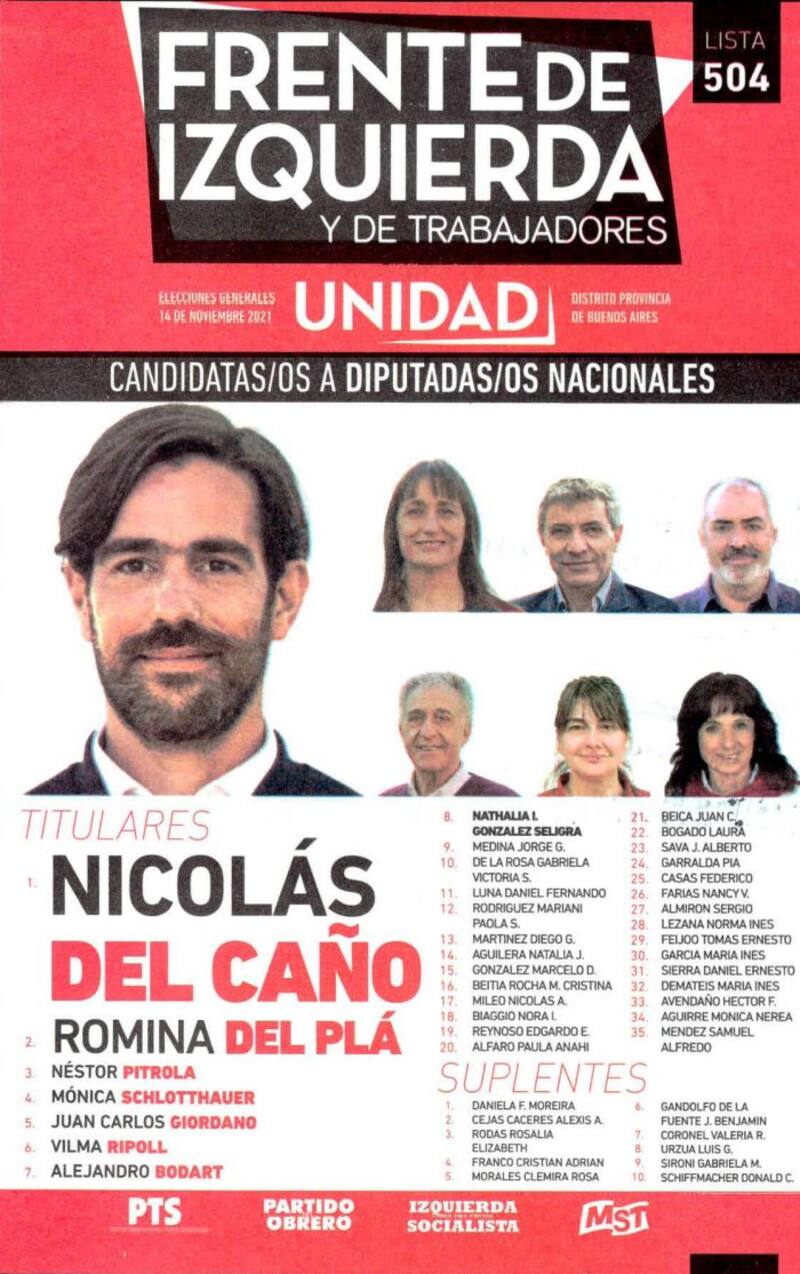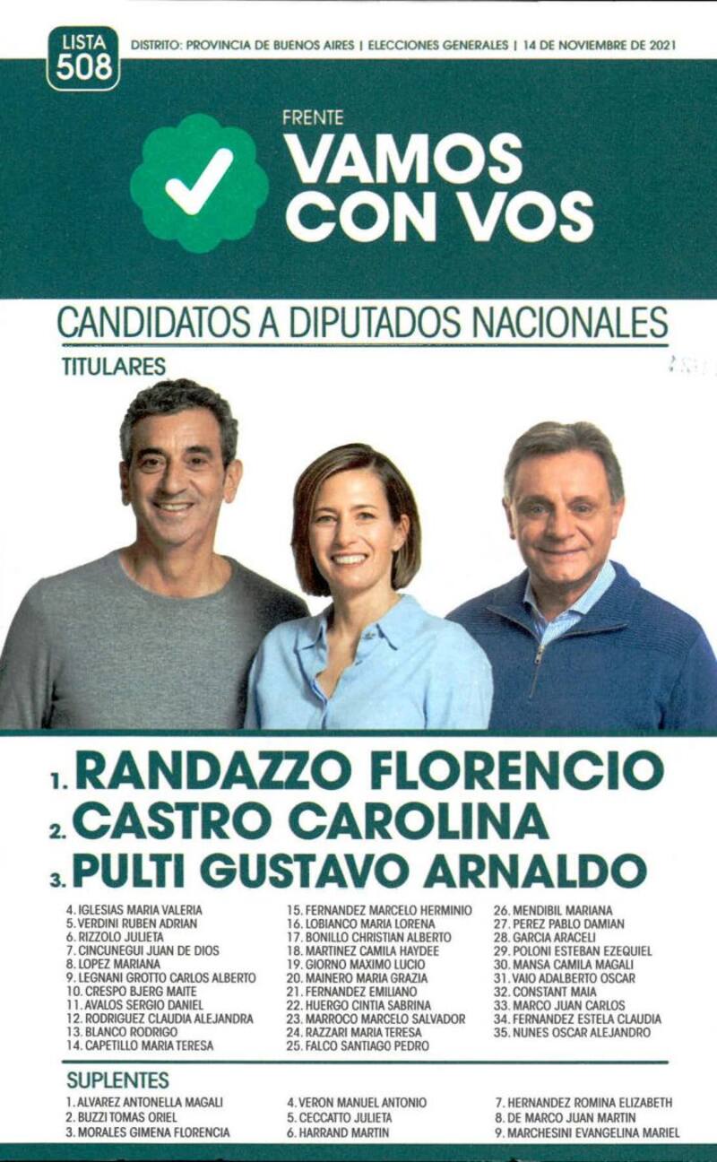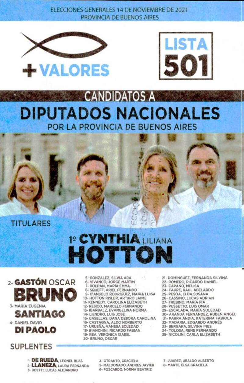 La boleta está encabezada por la contadora Victoria Tolosa Paz. En segundo lugar aparece Daniel Gollan, ex ministro de Salud bonaerense hasta 2021, y el tercer puesto lo ocupa la contadora pública Marcela Fabiana Passo.La boleta del Frente de Izquierda en la Provincia de Buenos Aires Los primeros puestos de la lista son para Nicolás del Caño, la ex diputada y docente Romina del Plá y el veterano dirigente Néstor Pitrola quien completa el podio de los tres primeros lugares.La boleta de + Valores, el partido de Cynthia Hotton, en la Provincia de Buenos Aires La fuerza política encabezada por Cynthia Hotton competirá con la misma boleta que en las PASO del 12 de septiembre, ya que no realizó internas en esa instancia electoral. En segundo lugar, figura Gastón Oscar Bruno, Presidente de la Asociación de Escuelas Evangélicas de Argentina, y completando los primeros puestos aparece María Eugenia Santiago, Doctora en Comunicación Social. La boleta de Avanza Libertad en la Provincia de Buenos Aires La boleta tiene al economista liberal José Luis Espert como primer postulante a diputado nacional, acompañado por la ex Cambiemos, Carolina Píparo, y a Hugo Bontempola.La boleta de Vamos con Vos, el partido de Randazzo, en la Provincia de Buenos Aires La boleta esta encabezada por el exministro de Cristina Kirchner, Florencio Randazzo, quien será secundado por la dirigente de la UIA Carolina Castro, mientras que el tercer lugar será para el intendente entre 2007 y 2015 de General Pueyrredón, Gustavo Pulti.