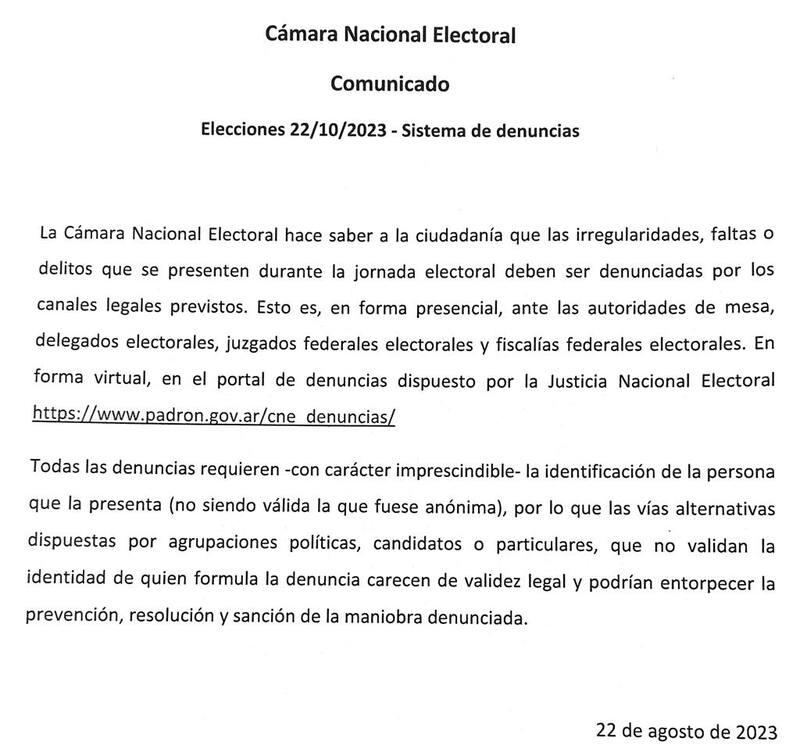 En este contexto, la Cámara Nacional Electoral hizo saber a la ciudadanía que "las irregularidades, faltas o delitos que se presenten durante la jornada electoral deben ser denunciadas por los canales legales previstos. Esto es, en forma presencial, ante las autoridades de mesa, delegados electorales, juzgados federales electorales y fiscalías federales electorales. En forma virtual, en el portal de denuncias dispuesto por la Justicia Nacional Electoral https://www.padron.gov.ar/cne denuncias/".