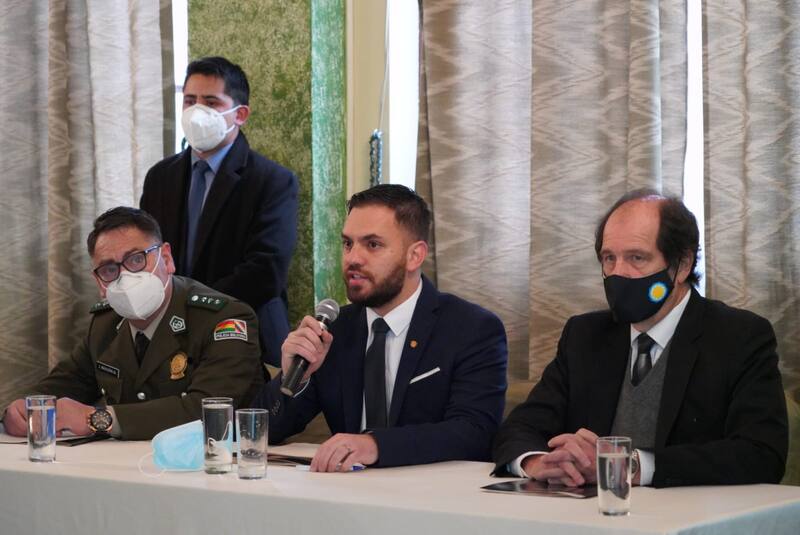 "Lo que ha cometido el comandante general de la Fuerza Aérea boliviana, Jorge Gonzalo Terceros, el General Jury Calderón y el embajador de Argentina en Bolivia del Gobierno de Macri, es tráfico ilícito de armas y esto está penado en nuestro país con 30 años de presidio sin derecho a indulto", destalló el funcionario durante la conferencia de prensa.