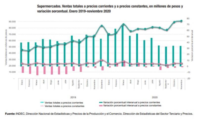 Medidos a precios constantes, es decir descontando el impacto de la inflación (tomando como referencia a diciembre de 2016), las ventas llegaron a $ 24.035 millones frente a los $ 24.292,2 millones de noviembre de 2019.