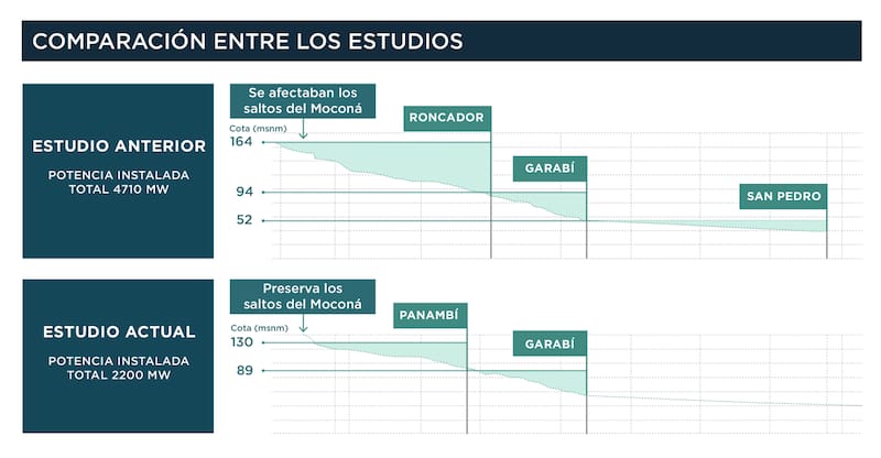 Garabí, en tanto, tendría 1152 MW de potencia, con un área de 642 km2 y 8 turbinas tipo Kaplan.
