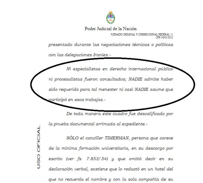 “Sólo el canciller Timerman, persona que carece de la mínima formación universitaria, en su descargo por escrito y que omitió decir en su declaración verbal, sostiene que lo redactó en un hotel del que no recuerda el nombre y con la sola compañía de su contraparte Iraní -el canciller Salehi-, el texto de ese documento sólo lo consultó, siempre según su versión, con Cristina Elisabet Fernández y Carlos Zannini y luego sin más viajó a Etiopia y lo firmó , señala el documento.