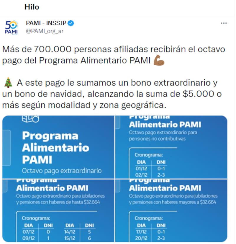 "Más de 700.000 personas afiliadas recibirán el octavo pago del Programa Alimentario PAMI. A este pago le sumamos un bono extraordinario y un bono de navidad, alcanzando la suma de $ 5000 o más según modalidad y zona geográfica", destacó el ente estatal en redes sociales.