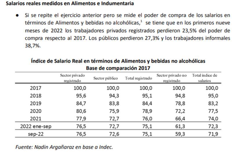 Por su parte, el doctor en Economía y director del Instituto Argentino de Análisis Fiscal (IARAF), Nadin Argañaraz, quien vaticinó que el techo del bono de fin de año podría ser de $ 30.000, ahondó en el estadio en el que arriban los ingresos de los privados registrados frente a la evolución del rubro Alimentos y bebidas no alcohólicas desde 2017, comportamiento que ya dejó una pérdida del poder adquisitivo acumulada del 23,5%.