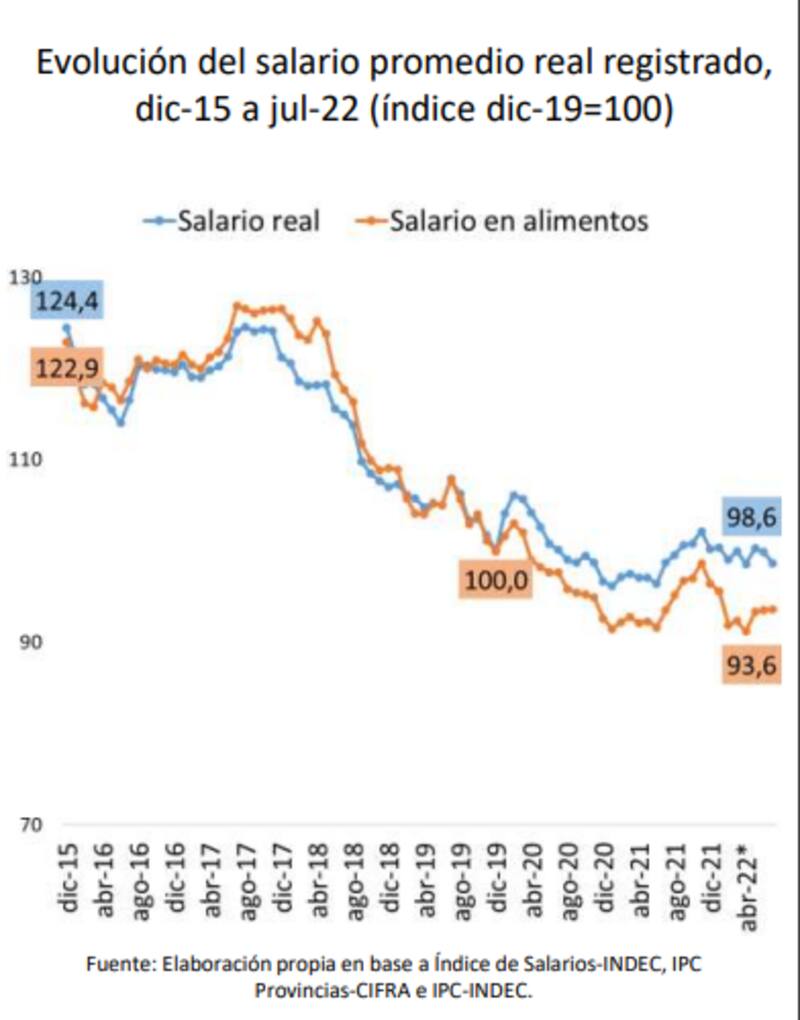 La pérdida real resulta incluso "sustancialmente mayor" cuando se evalúa el poder de compra del salario frente a los alimentos: según CIFRA, la capacidad promedio registrado en julio de 2022 resultó 6,4% menor que la de diciembre de 2019 y 23,8% inferior a la de diciembre de 2015.