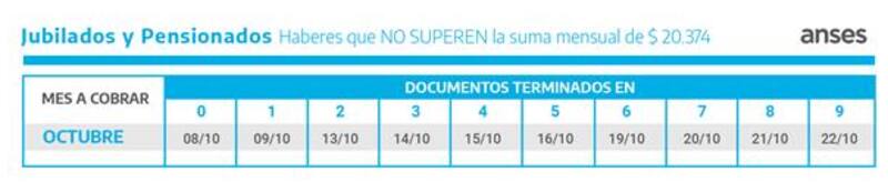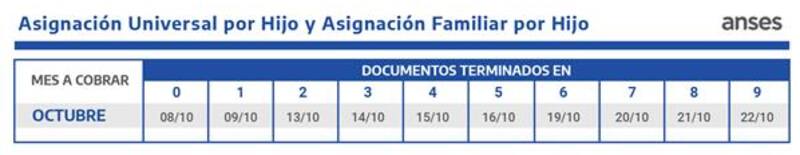 La Administración Nacional de la Seguridad Social (ANSeS) informó el calendario de pagos de octubre para jubilados y pensionados, Pensiones No Contributivas, beneficiarios de la Asignación Universal por Hijo y por Embarazo, de la Prestación por Desempleo y Asignaciones Familiares y de Pago Único (Matrimonio, Nacimiento y Adopción).
