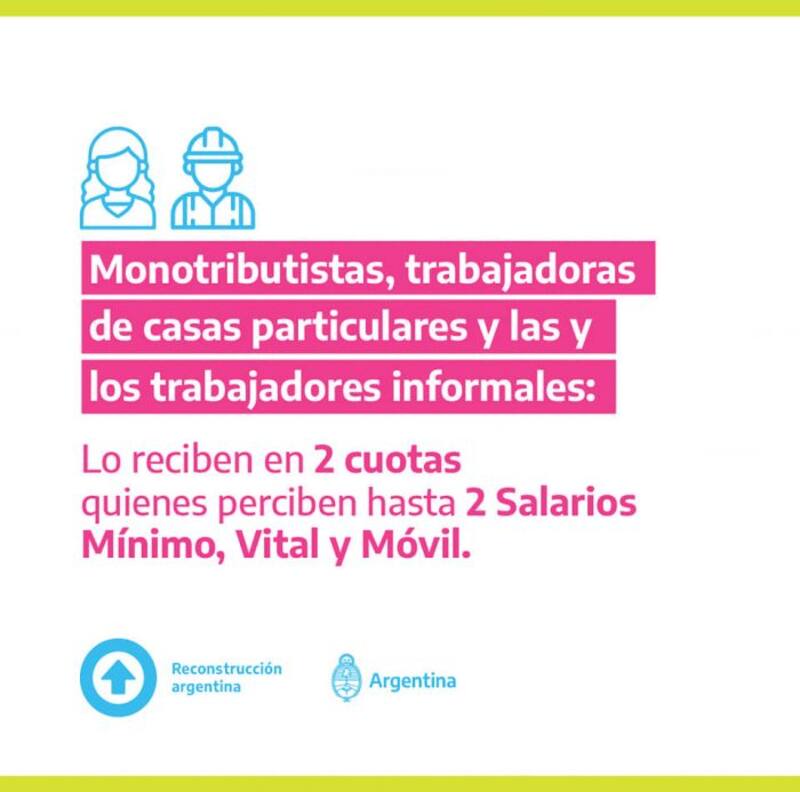 "A este refuerzo podrán acceder trabajadoras/es sin ingresos formales, trabajadoras/es de casas particulares y monotributistas sociales y de las categorías A y B", apuntó el organismo conducido por Fernanda Raverta, en su sitio web.
