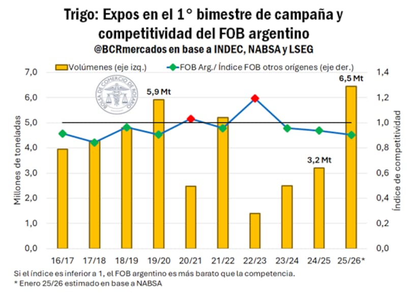 El primer bimestre de la campaña triguera 2025/26 ya es el más exitoso de la historia argentina. Según datos de INDEC y proyecciones de NABSA, los embarques totales alcanzaron las 6,4 millones de toneladas (Mt), superando el podio que hasta ahora ostentaba el ciclo 2019/20.