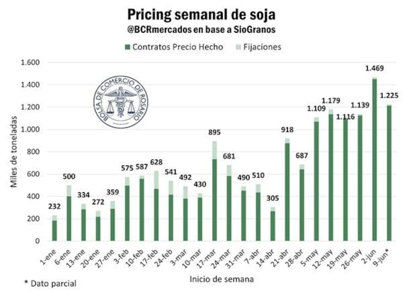 El último Reporte del Mercado de Granos de la Bolsa de Comercio de Rosario (BCR) destacó que "se acelera la comercialización de soja ante la inminente suba de retenciones el 30 de junio (30J), alcanzando máximos semanales de la campaña".