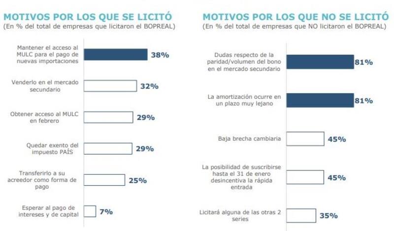 A la hora de responder sobre los no y los sí del Bopreal, la mayoría de las empresas indicaron que licitaron para mantener el acceso al MULC y para vender el bono en el mercado secundario.