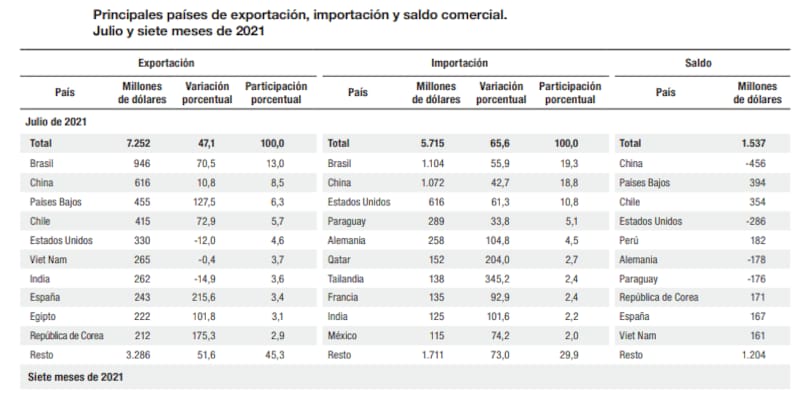 De esta manera, Brasil y China representan juntos un valor de exportaciones equivalentes a los cinco países que le siguen en el ránking, Estados Unidos, Chile, India, Vietnam y Países Bajos.