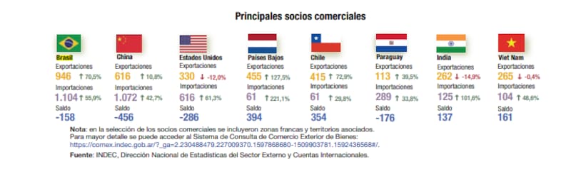 Con esos datos mantiene la primera posición entre los socios comerciales de Argentina, un lugar que lleva desde hace casi dos décadas y que sólo perdió a manos de China durante cuatro meses, entre abril y julio de 2020, cuando la pandemia de coronavirus virtualmente paralizó el comercio mundial, aunque no así el intercambio de productos alimenticios.