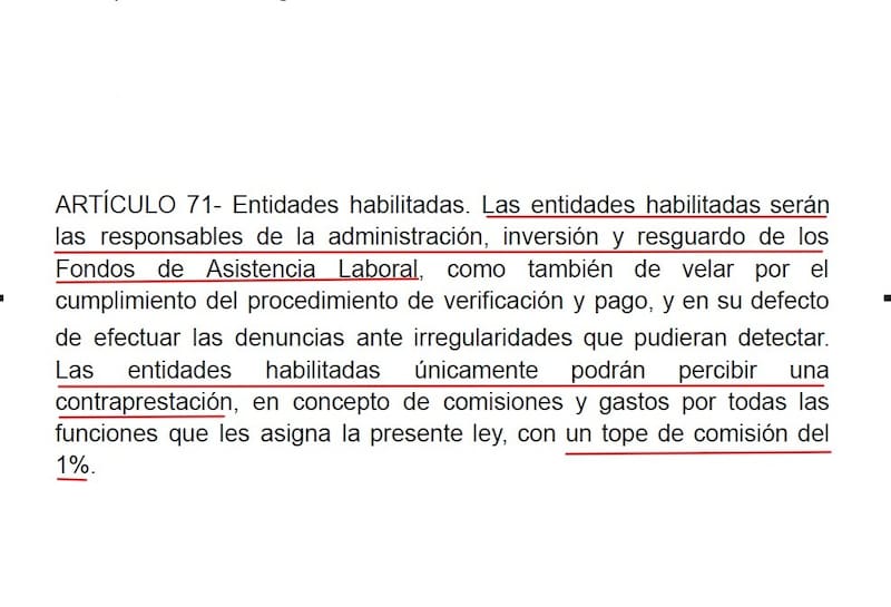 Otra modificación sustancial se observa en la administración del Fondo de Asistencia Laboral (FAL). El proyecto del Ejecutivo dejaba en manos de una definición posterior la resolución del monto de las comisiones que podrían cobrar las entidades encargadas de administrarlo, al señalar que la contraprestación “será establecida en la Reglamentación”.