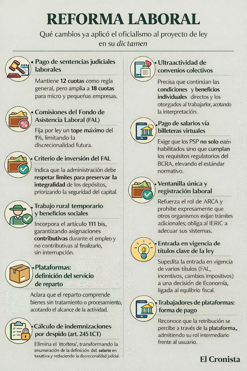 En el nuevo texto se mantiene el tope de doce cuotas como regla general, pero se agrega que “en el caso de las micro y pequeñas empresas podrán disponer el pago en hasta DIECIOCHO (18) cuotas”. La diferencia no es menor: introduce un trato diferencial para un segmento que suele tener menor espalda financiera, alargando el plazo de cumplimiento de sentencias laborales. Es, además, uno de los focos de mayor preocupación de la Casa Rosada por su capacidad de generar empleo.