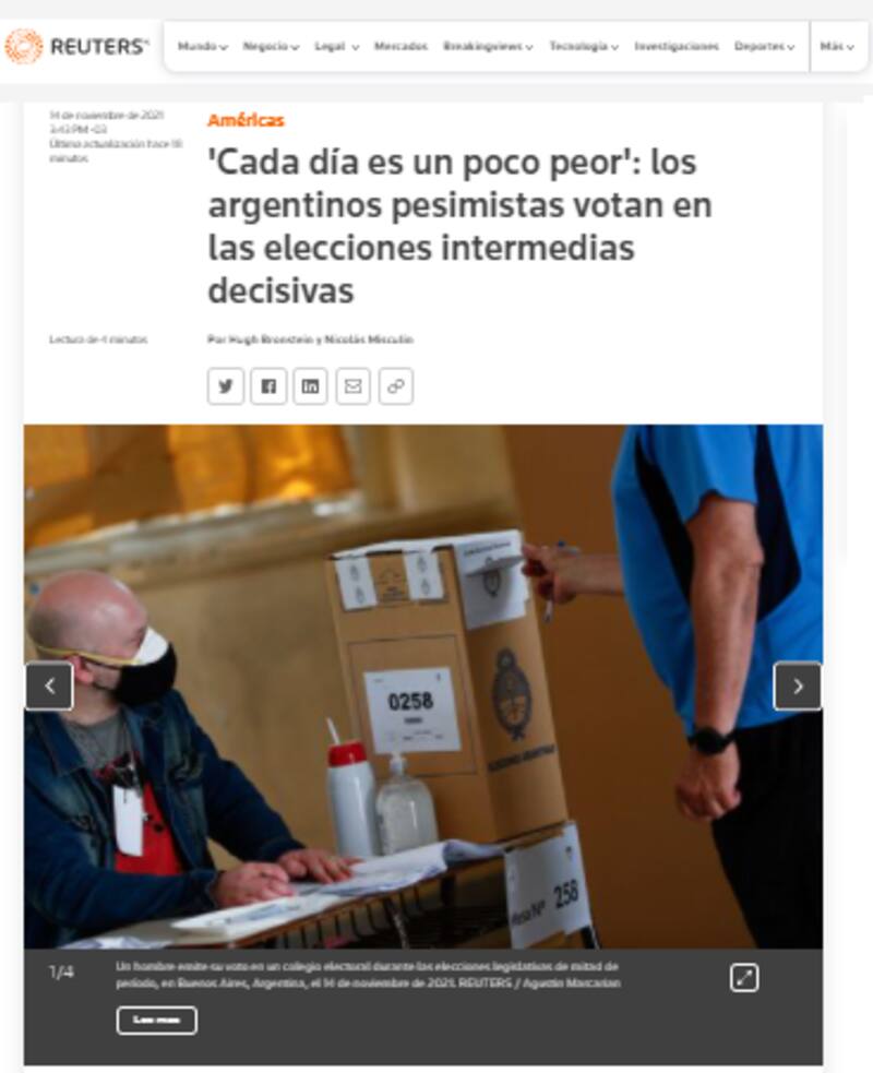 "La coalición peronista del presidente de tendencia izquierdista Alberto Fernández enfrenta un juicio de fuego mientras busca revertir una aplastante derrota en las elecciones primarias de septiembre, que si se repite podría obstaculizar al partido gobernante en los próximos dos años", apuntó la crónica del corresponsal en Buenos Aires.