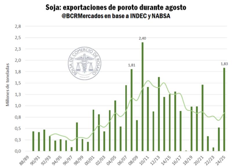 Durante julio los embarques superaron los 1,3 millones de toneladas, cuatro veces más que durante julio del 2024 , "un volumen que no veíamos para el séptimo mes en seis años", destacó la BCR.