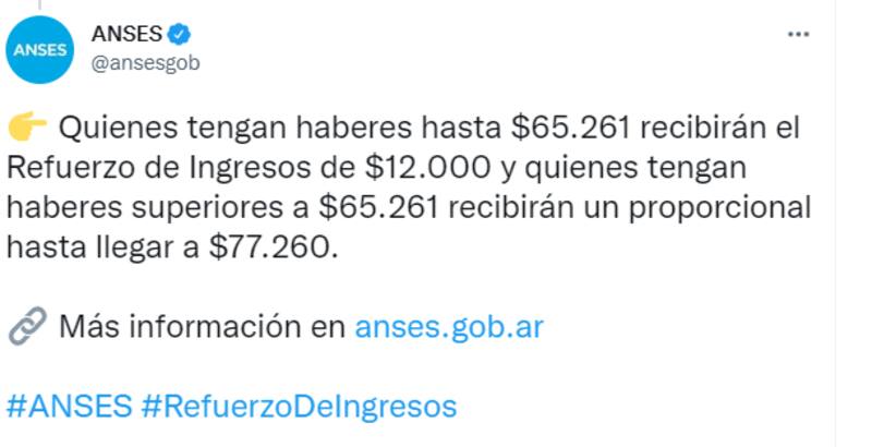 "Quienes tengan haberes hasta $65.261 recibirán el Refuerzo de Ingresos de $12.000 y quienes tengan haberes superiores a $65.261 recibirán un proporcional hasta llegar a $77.260", repasó el organismo conducido por Fernanda Raverta, en redes sociales.