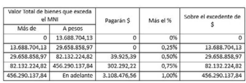 "A los fines del artículo 64 de la Ley N° 27.743, aquellos contribuyentes del artículo 17 del Título VI de la Ley N° 23.966 de Impuesto sobre los Bienes Personales, texto ordenado en 1997 y sus modificaciones, que cumplimenten las condiciones previstas en el segundo párrafo de dicho artículo 64, tributarán por los períodos fiscales 2023, 2024 y 2025, conforme a las siguientes escalas".