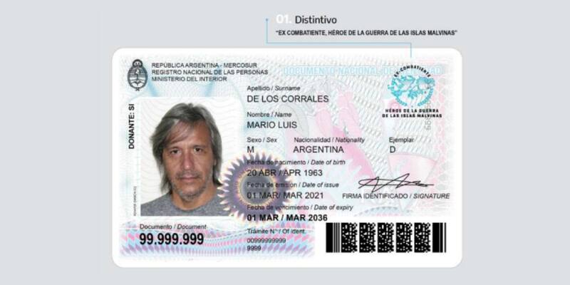 "Aquellas personas que acrediten la calidad de ex combatiente de la guerra de las Islas Malvinas, llevarán en el DNI el siguiente distintivo: 'EX COMBATIENTE, HEROÍNA DE LA GUERRA DE LAS ISLAS MALVINAS', 'EX COMBATIENTE, HÉROE DE LA GUERRA DE LAS ISLAS MALVINAS'", puntualiza la disposición.