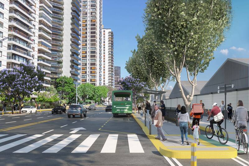 A lo largo de toda la avenida circulan 23 líneas de colectivo cuyas paradas que se reacomodarán en más de 60 plataformas. Entre las dársenas y las ciclovías se plantarán árboles para contribuir a disminuir las emisiones de dióxido de carbono.