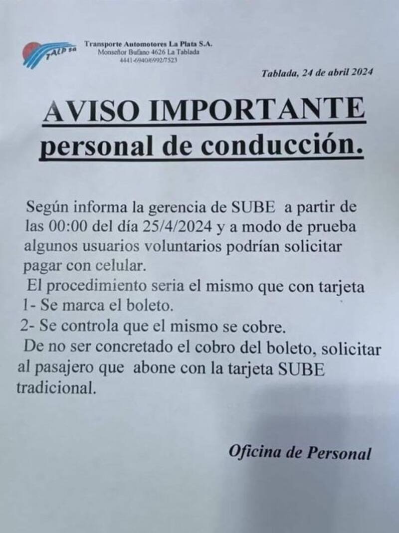 Una de las primeras empresas elegidas para probar el servicio en el AMBAfue Transportes Automotores La Plata (TALP), que le comunicó la novedad a sus choferes y les facilitó un instructivo para detallar cómo es la nueva modalidad de pago, que funcionará a la par de la tradicional tarjeta física.