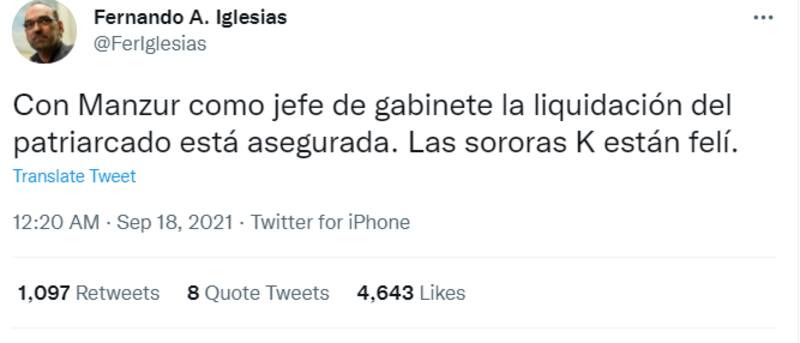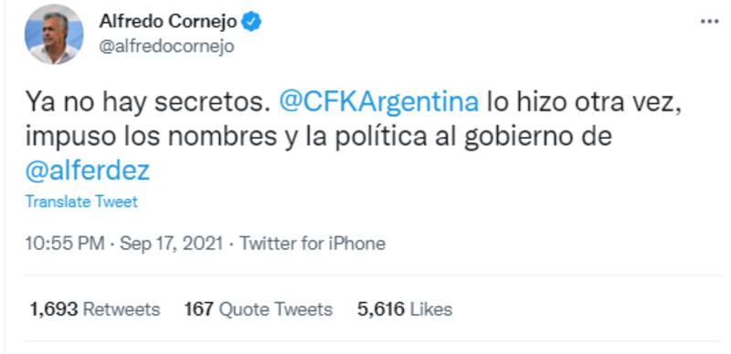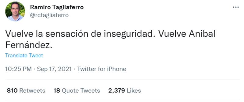 Y concluyó: "Es lamentable que la Argentina haya pasado de organizar el G20 a tener un canciller que se enteró por los medios que no iba a ser más canciller (en alusión a Felipe Solá) y después Alberto Fernández dice 'al nene no lo tocan, al nene no lo tocan' y manda a Cafiero a Cancillería, como si la Cancillería fuera un lugar de decoración".
