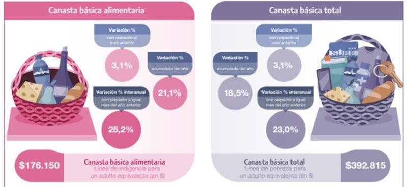 Además, los datos oficiales muestran que la Canasta Básica Total -que marca la línea de pobreza- subió 3,1% con respecto al mes anterior, acumulando un aumento del 18,5% en lo que va del año y 23% a nivel interanual.