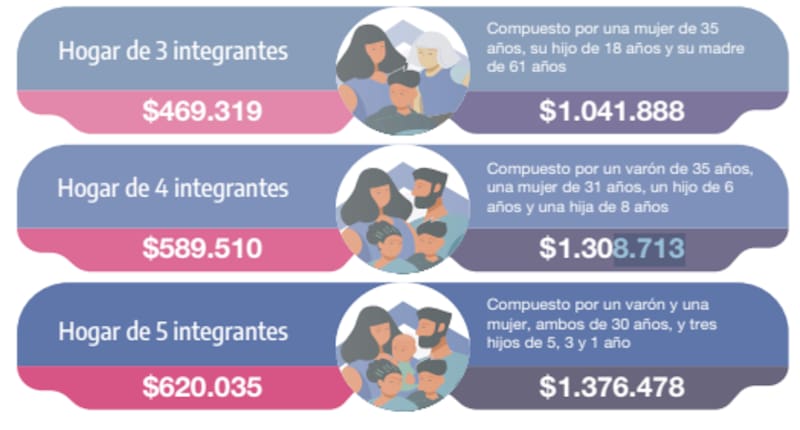 - Hogar de cinco integrantes (pareja de 30 años con tres hijos de 1, 3 y 5 años): $ 1.376.478.