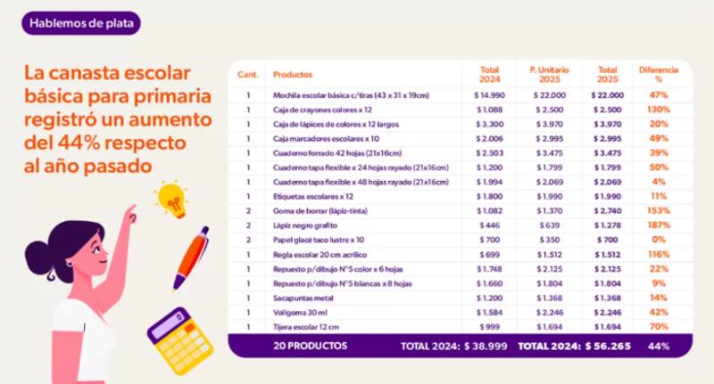 En la siguiente imagen se puede ver que los útiles básicos escolares para primaria, donde el total de una lista de 20 productos, incluye una mochila básica, y tiene un valor de $56.265, representa un aumento del 44% con respecto a los mismos productos del 2024, cuando sumaban$38.999.