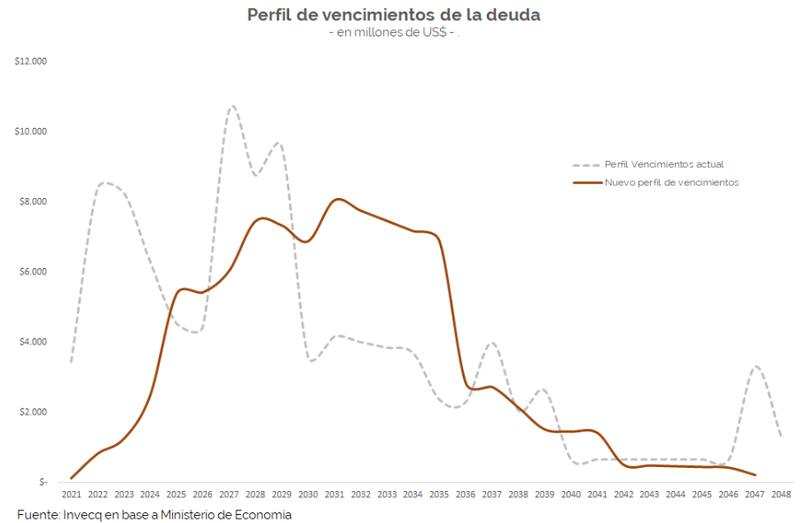De esta manera, el perfil de vencimientos de la deuda bajo legislación extranjera quedaría así, según estimaciones de la consultora Invecq, que incluye el canje de la deuda en dólares de ley local:
