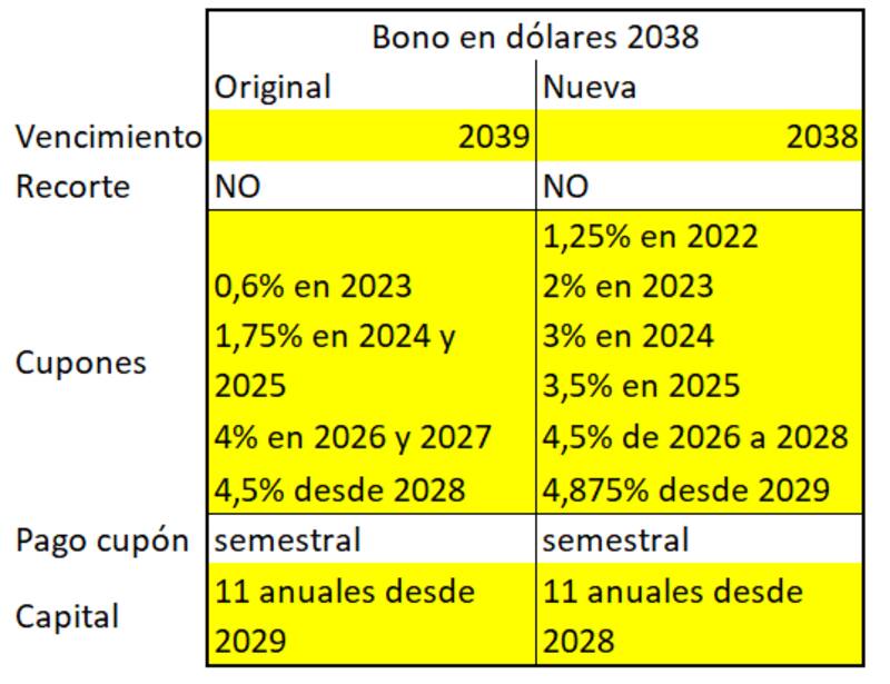 En las dos monedas se reduce el período de gracia (los cupones -semestrales en dólares y anuales en euros- cortan desde 2022 en vez de hacerlo desde 2023) y además se mejoran los intereses que se pagan a lo largo de la vida del bono.