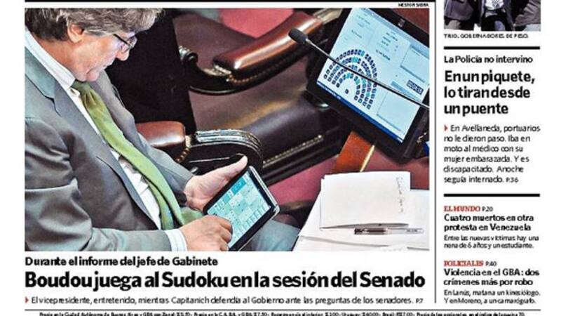 Durante la extensa exposición que hizo ayer el jefe de Gabinete, en la cual hizo un balance sobre su trabajo y respondió preguntas de legisladores de la oposición, Boudou, lejos de prestar atención, se entretuvo jugando al Sudoku, como publica hoy en su tapa el diario Clarín con una foto más que reveladora.