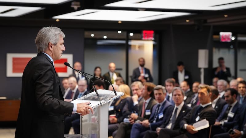 Su presentación fue precedida por palabras de bienvenida por Jim DeMare, copresidente del Bank of America. Jamie Dimon había sido ayer quien introdujo a Javier Milei. “Sé que partió ya de regreso y que no pudo estar aquí con nosotros, lo que lamento mucho porque me hubiera encantado tener una foto con Milei”, comentó DeMare.