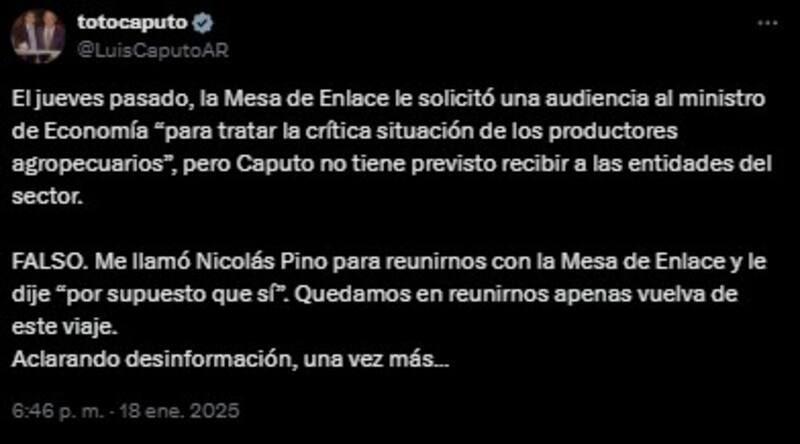 Tras los reclamos de la Mesa de Enlaceante la "crítica situación del campo", el ministro de Economía Luis Caputo confirmó este sábado que mantendrá en los próximos días una reunión con los integrantes de las entidades ruralistas.