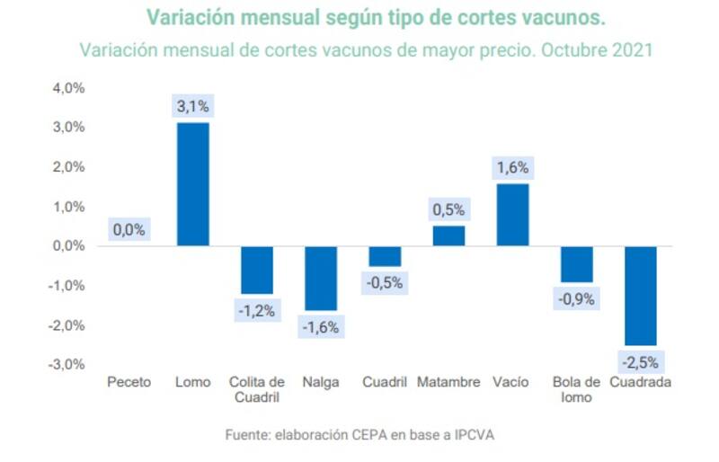 Sin embargo, apuntó, "todavía los aumentos acumulados en el año 2021 en la mayoría de los cortes vacunos continúan muy por encima del nivel general de precios".