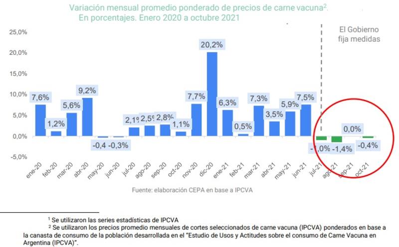 Tras hacer referencia a las medidas adoptadas por el Gobierno para poner coto a la suba del precio local de la carne, en un contexto de elevada inflación, CEPA destaca que "el efecto de dichas políticas se vio de manera inmediata: no sólo se cortó la dinámica alcista de un mes para otro, sino que los precios retrocedieron acumulando una caída del 3% en los últimos 4 meses".